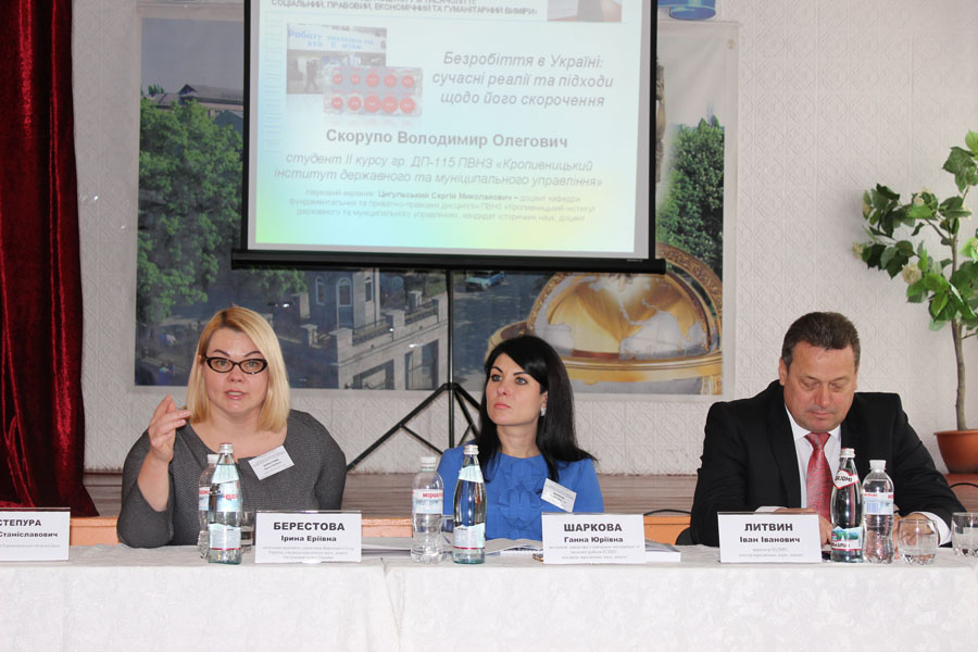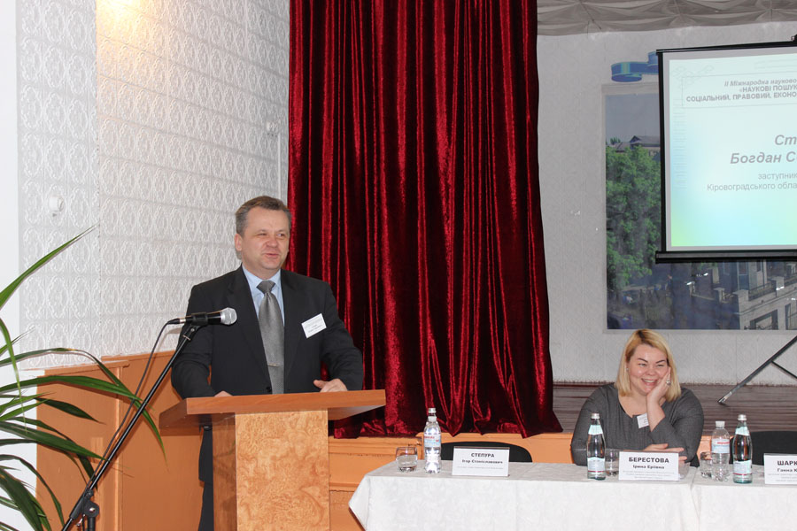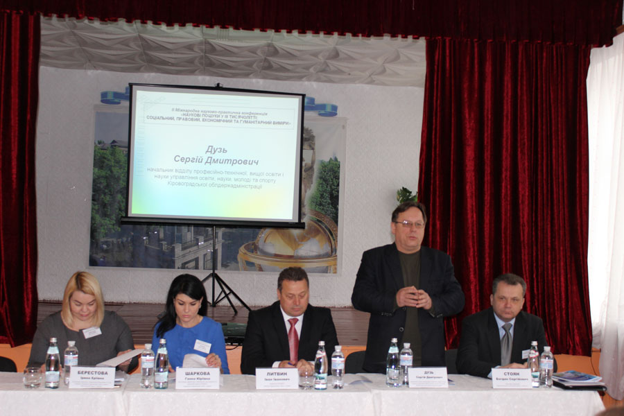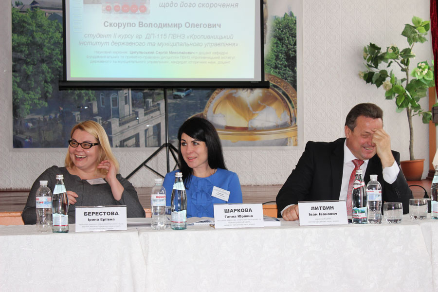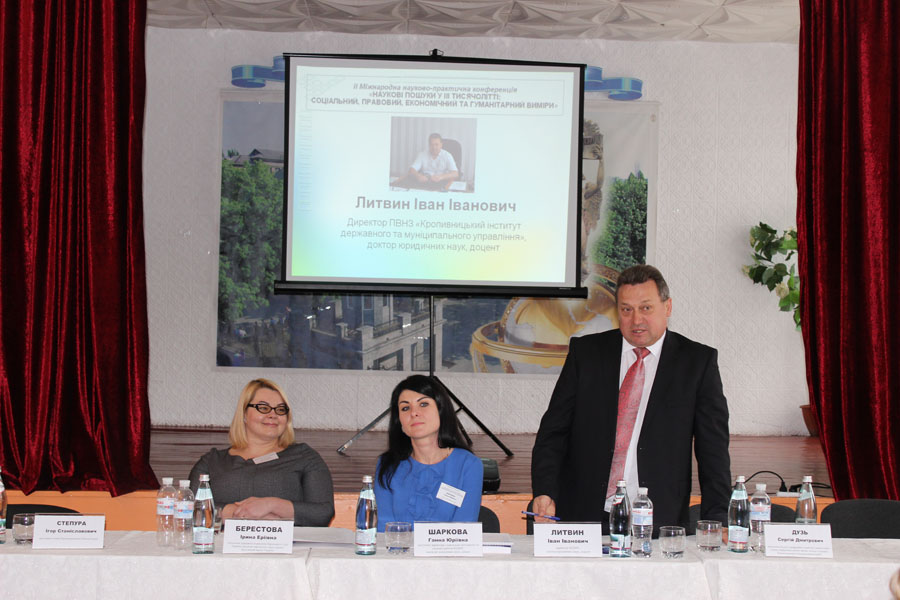 Під час урочистого відкриття конференції з вітальним словом до учасників звернувся директор ПВНЗ «Кропивницький інститут державного та муніципального управління», доктор юридичних наук, доцент Литвин Іван Іванович, який зазначив, що такі наукові заходи сприяють поглибленню наукового діалогу та є підтвердженням високого рівня вітчизняної науки й непересічного інтересу різних поколінь наукової спільноти до ролі наукових досліджень у формуванні суспільного поступу в ІІІ тисячолітті. Побажавши всім учасникам плідної та творчої праці, заступник директора з навчально-методичної та наукової роботи ПВНЗ «Кропивницький інститут державного та муніципального управління», кандидат юридичних наук, доцент Шаркова Ганна Юріївна запропонувала регламент для виступів на пленарному засіданні та питань до доповідачів.